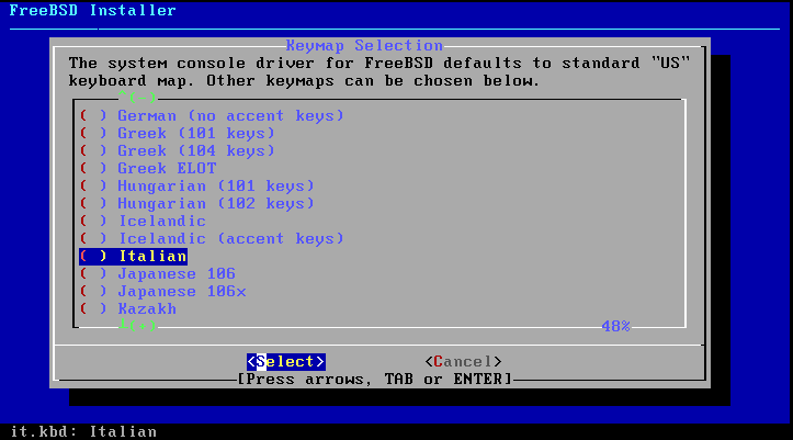 Come prima cosa occorre selezionare il proprio layout di tastiera spostandoci con le freccette sulla voce corrispondente e confermando premendo invio