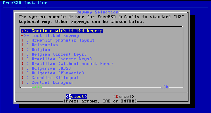 Quindi l'installer ci propone un test per verificare che il layout scelto sia effettivamente quello giusto. Se volete effettuare il test lasciate selezionata l'opzione "Test it.kbd keymap" e premete invio. Altrimenti spostatevi su "Continue with it.kbd keymap" e confermate premendo nuovamente invio