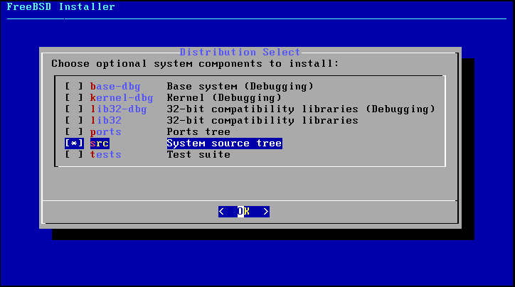 Selezioniamo, quindi, soltanto l'opzione "src" (ovvero l'albero dei sorgenti) perchè è utile quando si eseguono gli aggiornamenti del core del sistema e confermiamo con il tasto invio.