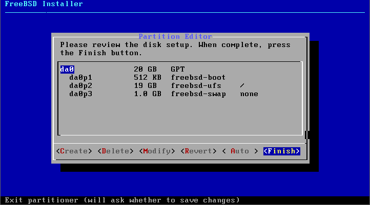 Nella finestra successiva viene riepilogato lo schema di partizionamento proposto in automatico dall'installer di FreeBSD.