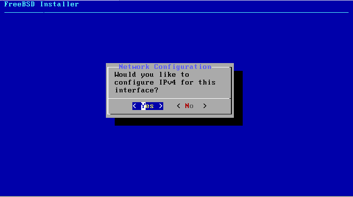 Il sistema ci chiede se vogliamo configurare l'interfaccia di rete utilizzando il protocollo IPv4; selezioniamo "Yes" e confermiamo con invio.