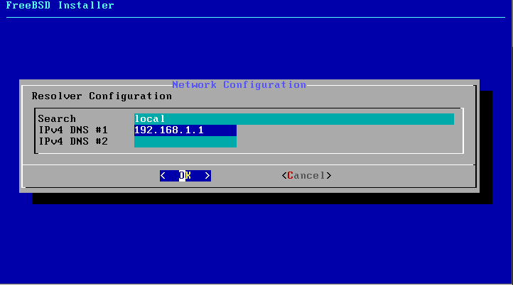 Qui bisogna inserire altre informazioni di rete. Se non avete un dominio, inserite "local" in search e poi l'indirizzo IP del vostro DNS. Quindi selezionate "Ok" ed invio per confermare.