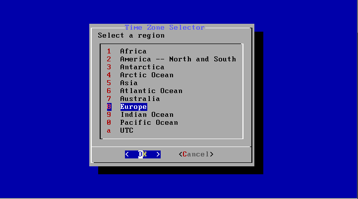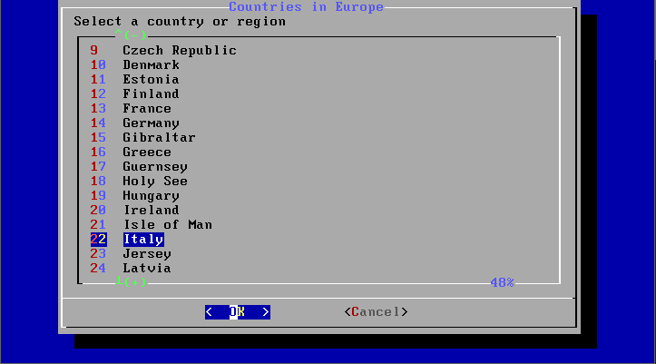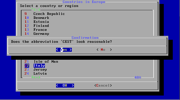 Nelle prossime tre schermate selezionate la regione, la nazione e confermate l'abbreviazione proposta in modo da regolare correttamente l'orologio del server.