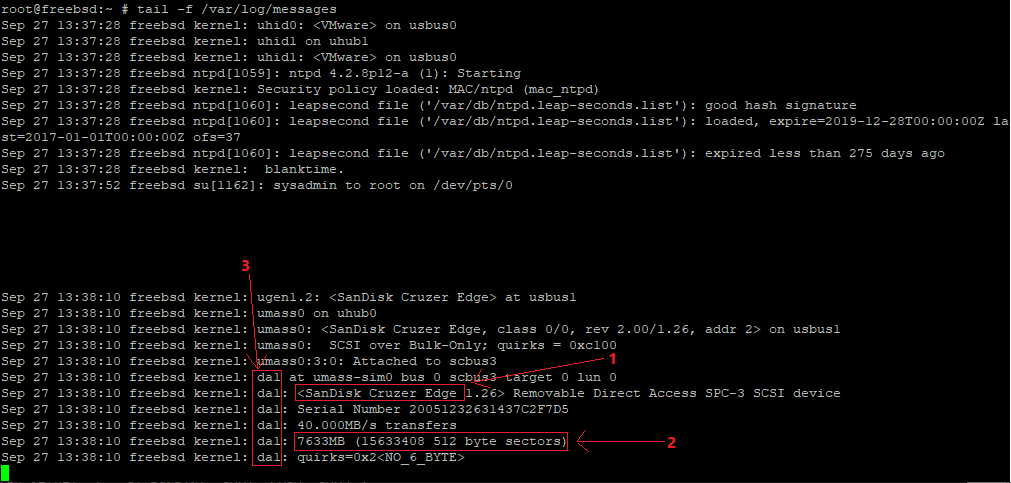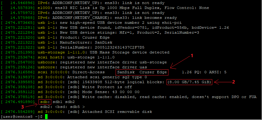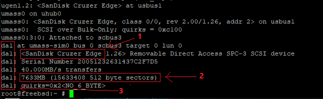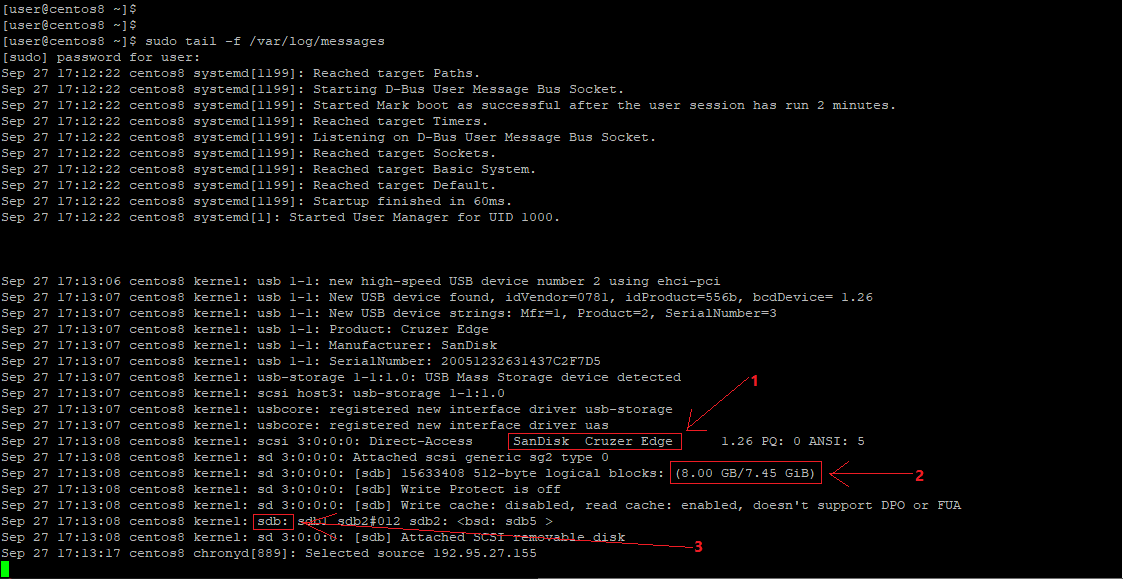 Alla fine del log visualizzato nel terminale si troveranno i dati del dispositivo USB; assicurarsi che (1) il nome del dispositivo corrisponda, (2) la dimensione rilevata sia giusta e (3) prendere nota del nome assegnato al dispositivo USB
