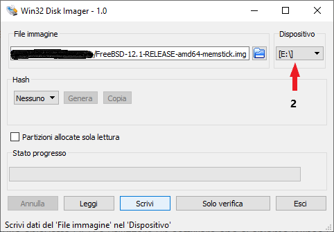 Assicurarsi che la lettera evidenziata nella sezione "Dispositivo" corrisponda effettivamente alla chiavetta USB, altrimenti tutti i dati presenti in quel dispositivo saranno eliminati definitivamente.